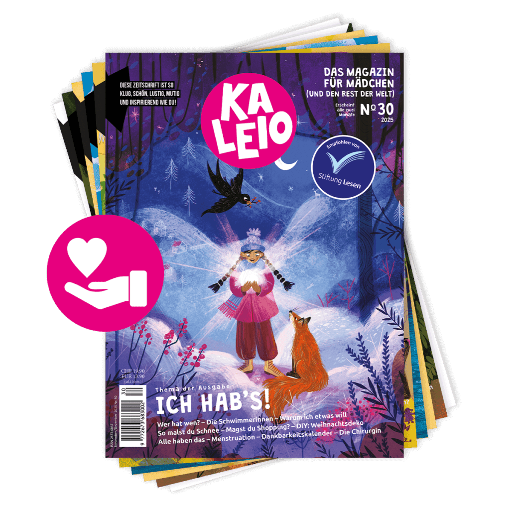 Mit dem KALEIO-Patenschaftsabo schenkst du einem Mädchen ein Jahr lang positive Vorbilder, Inspiration und Spass. Du entscheidest, welche Schweizer gemeinnützige Institution dein Abo an ein Mädchen aus ihrem Wirkungskreis weiterleitet. Gemeinsam machen wir es möglich, das Magazin auch für Mädchen aus Familien mit kleinem Budget zugänglich zu machen. Danke!