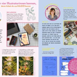Und es gibt noch mehr zu entdecken: Mary nimmt dich mit an ein Filmset, Milena erzählt, warum Sportfitness für sie die perfekte Sportdisziplin ist, und Caroline berichtet von ihrer Erfindung. Lina aus Tunesien verrät dir, wo der schönste Ort in ihrem Land ist, und Marina empfiehlt dir ihre zwei Lieblingsbücher. Du lernst vier Illustratorinnen kennen, deren Arbeiten du aus dem Magazin kennst. Sie erzählen, wie sie beim Arbeiten vorgehen. Werde Innenarchitektin, plane deine Traumwohnung und lerne, wie du süsse Meerschweinchen filzen kannst.